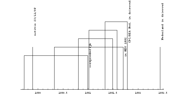 In figuur 3 worden werkplannen uit die periode gegeven, als rechte vorken met de labels aan het geplande eindpunt. Het werk op de afd. Lange Termijn is natuurlijk onmiddellijk na afronding van de vorige studie van 1985 begonnen, aanvankelijk ook met een relatief vage einddatum. Na enkele mislukte aanzetten werd in september 1989 de afronding gepland op 31 december 1990 (hier: "oorspronkelijk"). Het project heeft twee keer zo lang geduurd, nl. tot medio 1992. Tussentijds zijn er diverse herzieningen geweest, soms ook met het oog op een MEV en bespreking in de CPC/REA. Een apart moment was mijn notitie van 23/11/89 die de vraag opwierp of e.e.a. niet handiger en echt sneller kon. Niet afgebeeld is de ‘WAO-zomer’ van 1991 (bij 1991,5).